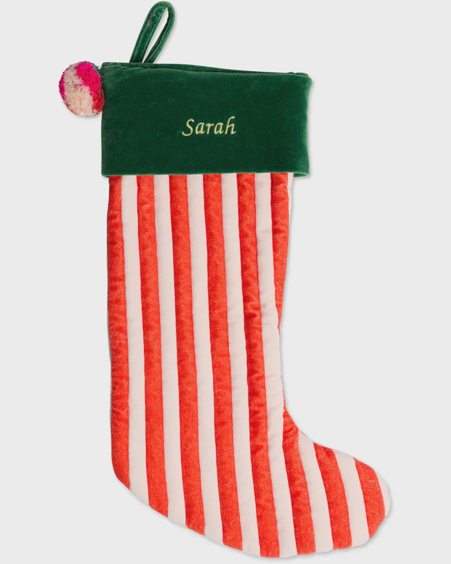 Hang it with care and fill it with cheer! Our Jolly Christmas Velvet Stocking is the perfect place for Santa’s sweetest surprises, little treasures, and treats galore. A merry must-have to make Christmas morning extra magical. Made from our signature 100% cotton velvet in red and white quilted stripes with green trim and feature pom pom.