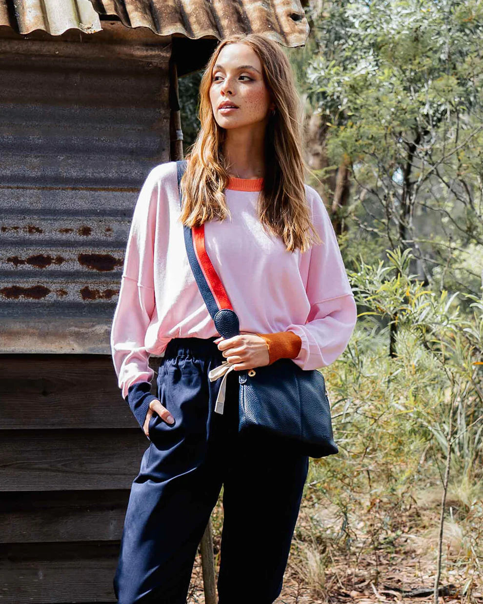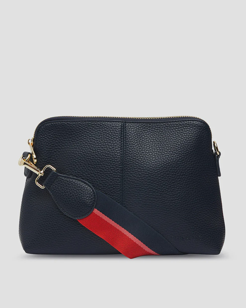The Elms+King Burbank Crossbody Large offers the functionality and hands-free ease of the compact best-selling Burbank, just with added capacity. Made from premium 100% recycled polyurethane with 14-karat light gold-plated hardware, the Burbank Crossbody Large offers a secure top zipper, our signature blue & white gingham lining and ample depth for all your essentials. The bag comes with two strap options, one wide cotton webbing strap in our exclusive custom stripe, adjustable to 140cm and a second narrow PU strap, also adjustable to 140cm.