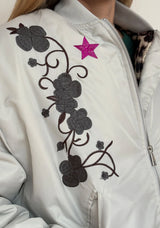 Bold, edgy, and full of detail, this lightly lined bomber jacket is designed to stand out. Featuring elaborate embroidery on both the front and back, it’s a true eye-catcher with a smooth, comfortable feel. The ribbed college collar and sleeve cuffs add a sporty touch, while the leopard-print lining brings unexpected flair. Finished with welt pockets with flaps, sleeve pockets, and side zips at the hem for added versatility, this jacket blends street style with statement-making sophistication. Crafted with a durable outer of 100% nylon and a soft polyester lining, it’s the perfect layer for transitional weather.