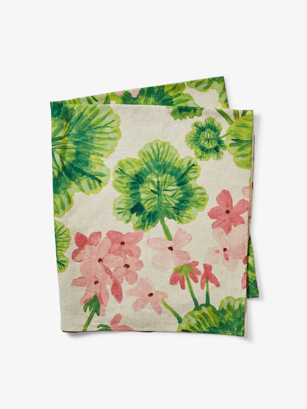 Wild and painterly, this linen tablecloth bursts with overgrown geranium flowers in sun-warmed pink and green. A garden-inspired design that turns every meal into a celebration.
