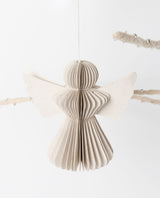 Set of two honeycomb paper angels with an eggshell coloured body and white wings. The clever design easily folds in half to preserve the folds and ensure compact storage for years to come. Complete with disguised internal magnets to strongly bond the edges seamlessly and snap in place.