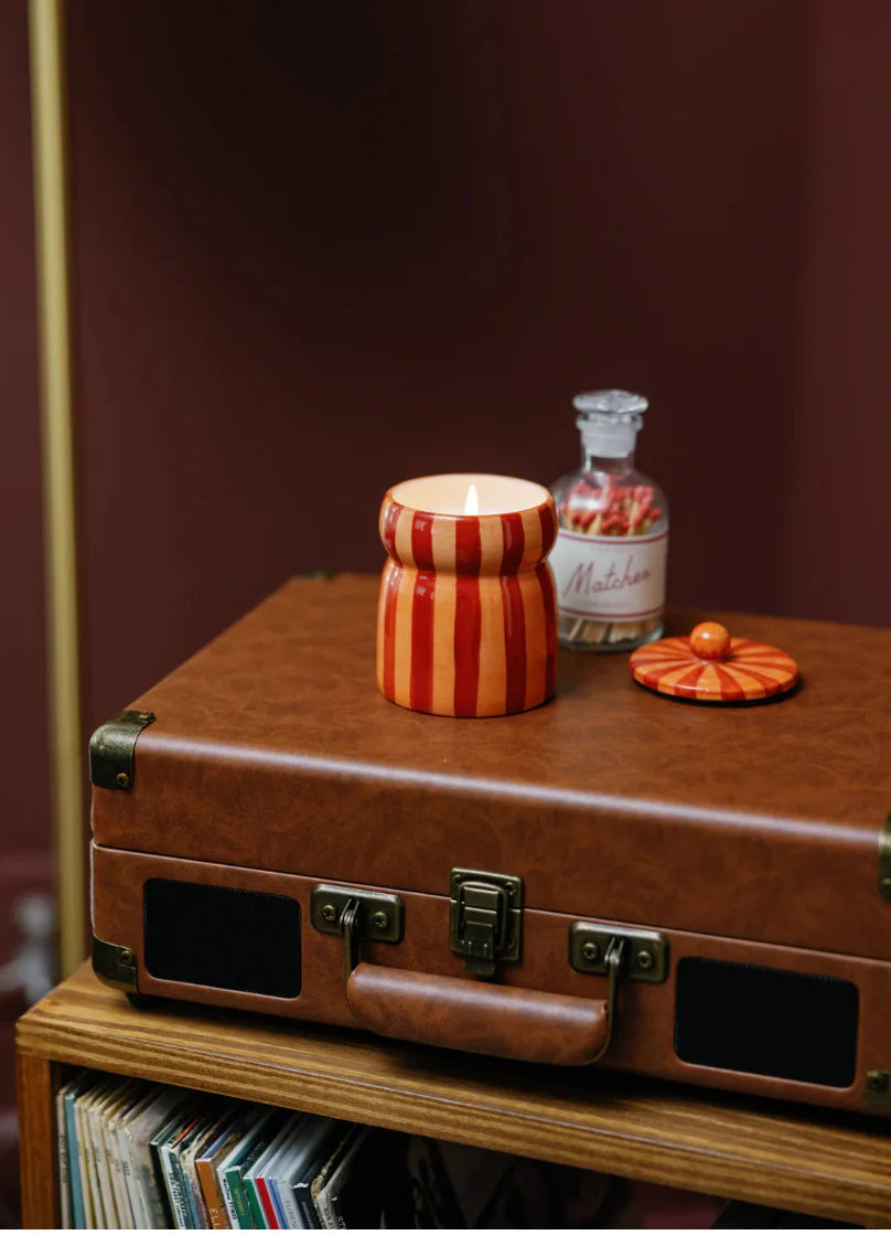 Bring home the holiday season with the Spiced Apple cabana ceramic candle. Housed in a hand-painted orange and red vessel with a matching lid, this festive candle blends crisp apple with warm spices for a cozy, nostalgic scent. Once the candle has finished, the lidded ceramic jar can be reused as a decorative container or storage piece.