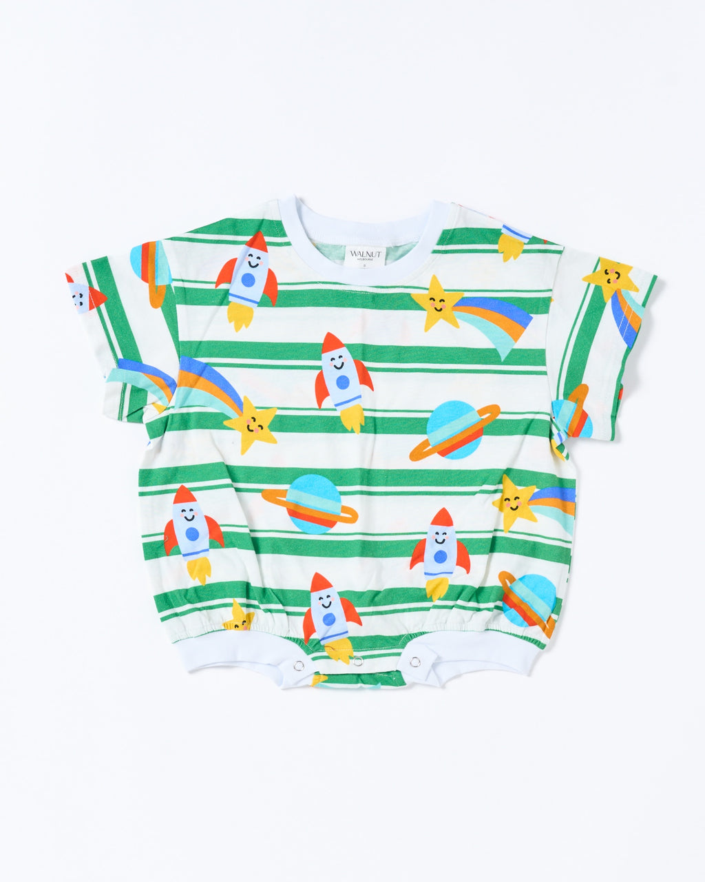 Made for curious little explorers, this comfy romper features evrything space. Rocket Man, stars, planets with playful green strips and contrast trim. With snap buttons for quick changes and a relaxed fit for wriggly days, it’s a go-to for everyday adventures—whether you're on the move or just asking the big questions!