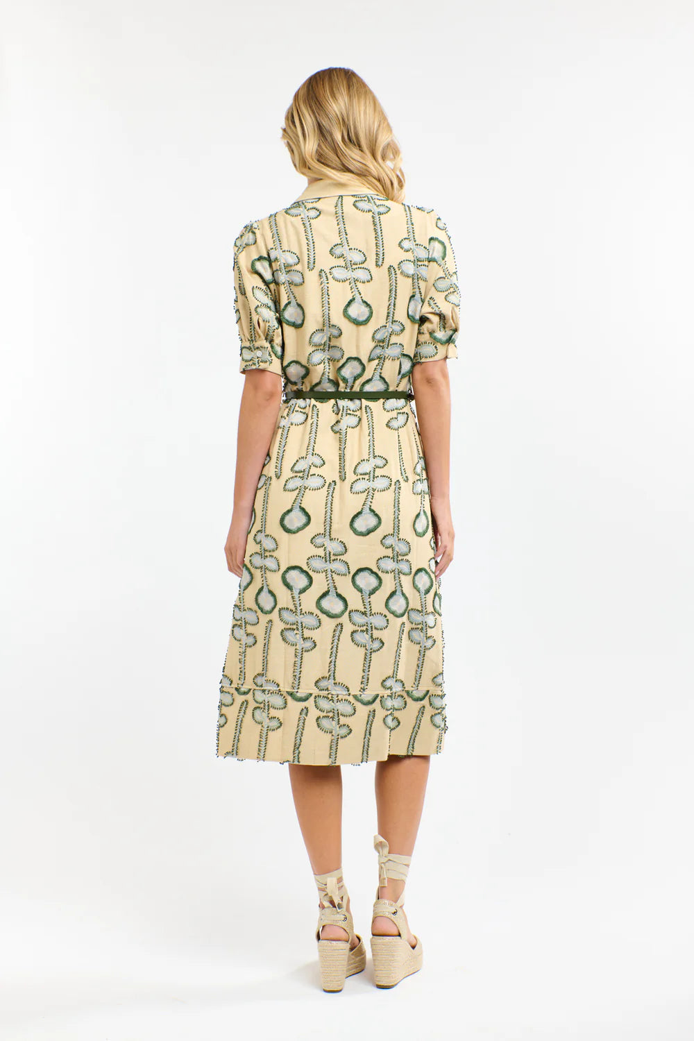 Feminine, comfortable and full of texture, the Eden Embroidered Dress brings easy polish to warm days. Raised embroidery adds depth across a soft viscose–linen base, while the button-through shirt shape keeps it stylish and simple to wear. Use the slim belt to define the waist or wear loose for a relaxed feel. Finish with espadrilles or a block heel for day-to-dinner ease.