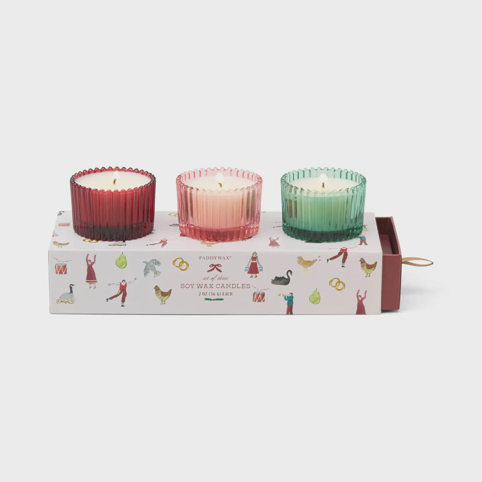 Introducing our new collection of ribbed glass tinted in rich hues and filled with festive scents. Hand illustrated artwork inspired by the classic 12 Days of Christmas adorns each package. These 2 oz candles come in a special giftbox that's fun to open. Just add a bow!