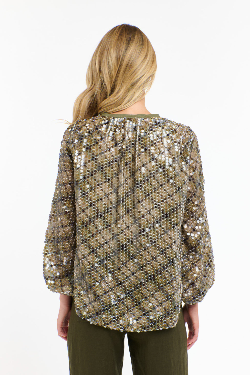 Shimmer with effortless elegance in this softly relaxed sequin top. Designed from textured sequinned fabric, it drapes beautifully on the body for a flattering fit. The long sleeves feature gentle volume for a touch of sophistication, while the keyhole neckline with a loop button closure adds subtle detail. Finishing at the hip, this piece is perfect for pairing with tailored pants or sleek skirts for easy, elevated styling. Made from 100% polyester.